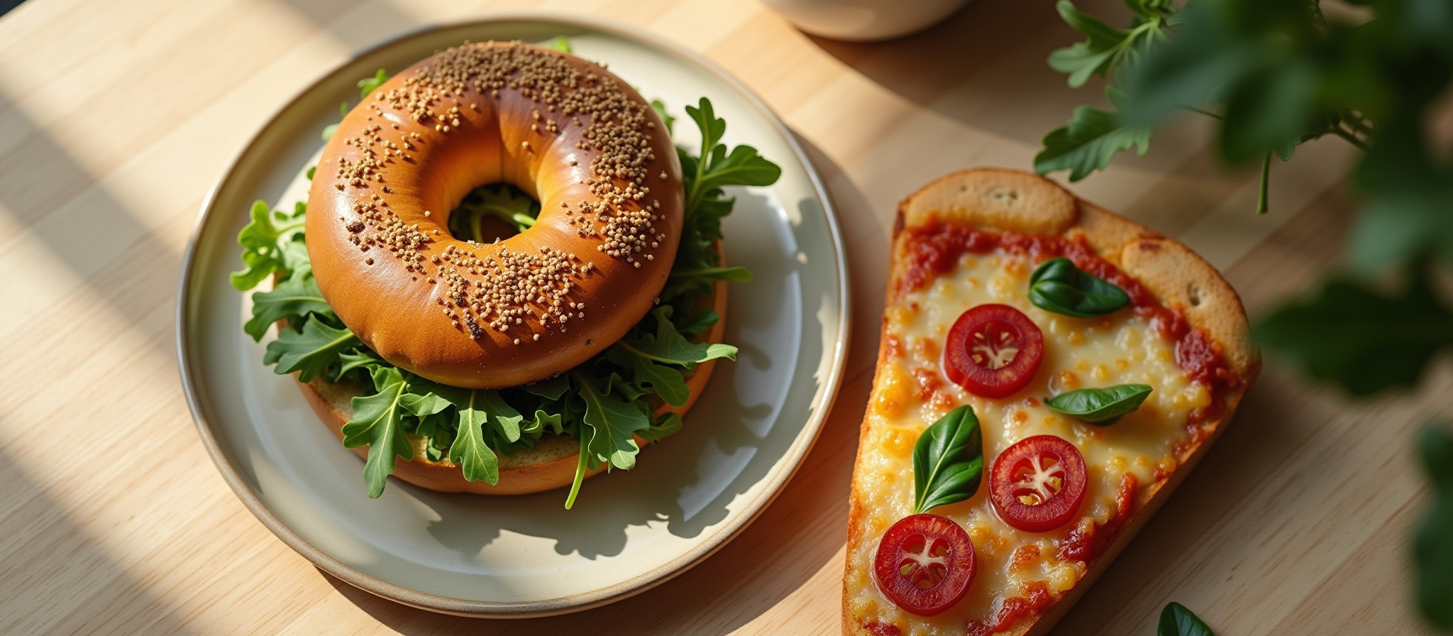 Bagel or wrap sandwiches, salads, homemade soups and thin crust pizza.